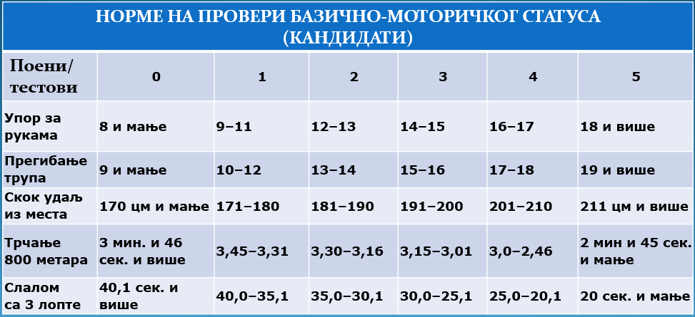 Оцену не задовољава добија кандидат који укупно освоји 7 или мање поена, односно кандидат који на било ком делу провере базично-моторичког статуса освоји 0 поена.